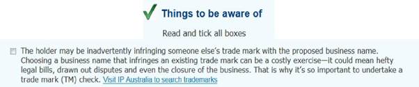 As a precaution, you should always check whether your business name may infringe a registered trade mark by conducting a trade mark search using the Australian Trade Mark Search function on IP Australia’s website, as well as an internet search for similar instances of the name. This is because the Business Names Register only alerts the registrant if the registrant is seeking to register a business name that is identical (an exact match) with another registered business name. It will not search the Australian Trade Marks Register for substantially identical or deceptively similar names.